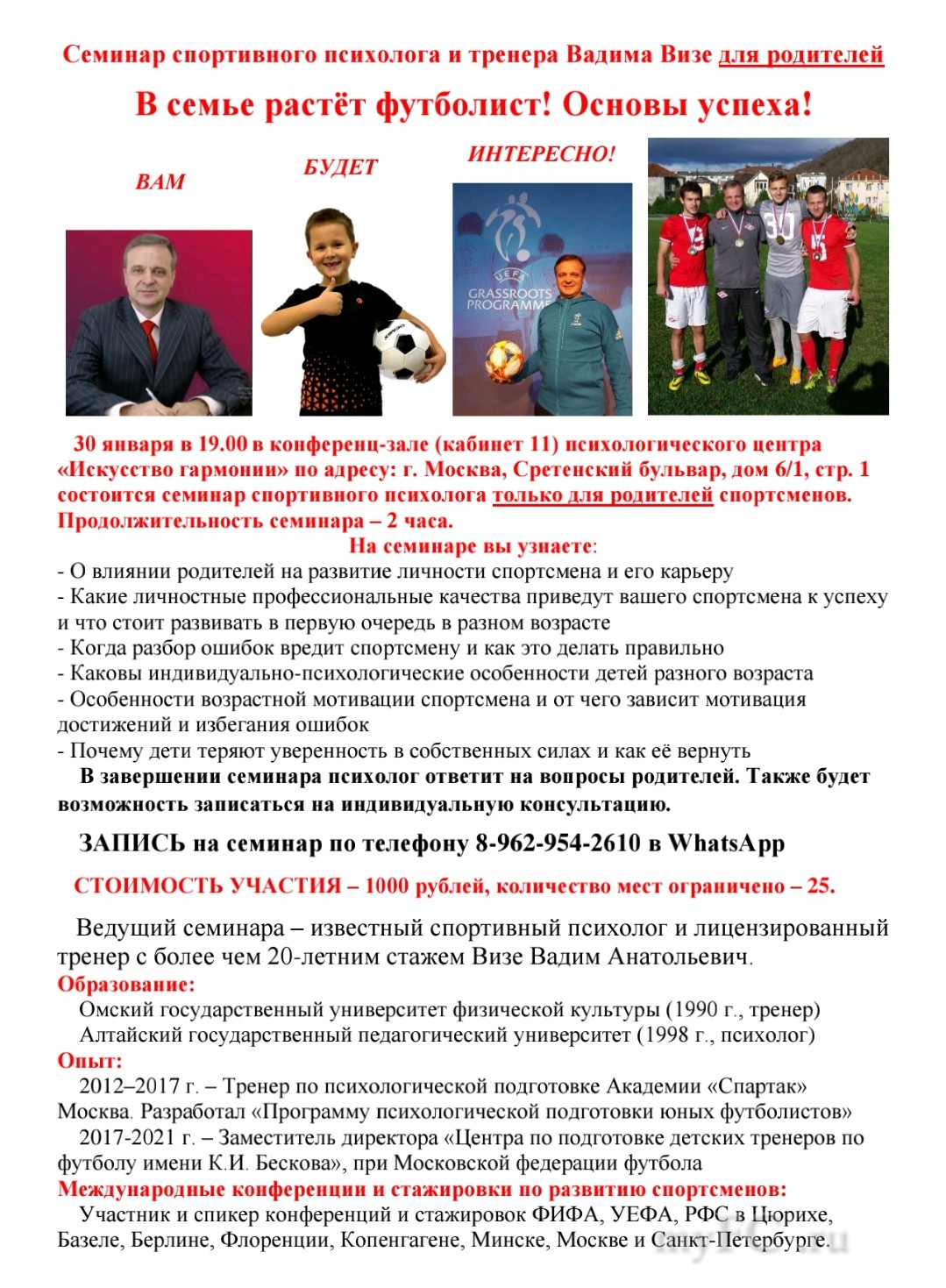 30 января в 19.00 в конференц-зале (кабинет 11) психологического центра «Искусство гармонии» по адресу: г. Москва, Сретенский бульвар, дом 6/1, строение 1 состоится семинар спортивного психолога только для родителей спортсменов. Продолжительность семинара – 2 часа. На семинаре вы узнаете: - О влиянии родителей на развитие личности спортсмена и его карьеру - Какие личностные профессиональные качества приведут вашего спортсмена к успеху и что стоит развивать в первую очередь в разном возрасте - Когда разбор ошибок вредит спортсмену и как это делать правильно - Каковы индивидуально-психологические особенности детей разного возраста - Особенности возрастной мотивации спортсмена и от чего зависит мотивация достижений и избегания ошибок - Почему дети теряют уверенность в собственных силах и как её вернуть В завершении семинара психолог ответит на вопросы родителей. Также будет возможность записаться на индивидуальную консультацию. ЗАПИСЬ на семинар по телефону 8-962-954-2610 в WhatsApp Ведущий семинара – известный спортивный психолог и лицензированный тренер с более чем 20-летним стажем Визе Вадим Анатольевич. Образование: Омский государственный университет физической культуры (1990 г., тренер) Алтайский государственный педагогический университет (1998 г., психолог) Опыт: 1976-2012 г. - игрок и тренер по футболу 2012–2017 г. – Тренер по психологической подготовке Академии «Спартак» Москва. Разработал «Программу психологической подготовки юных футболистов» 2017-2021 г. – Заместитель директора «Центра по подготовке детских тренеров по футболу имени К.И. Бескова», при Московской федерации футбола Международные конференции и стажировки по развитию футболистов: Участник и спикер конференций и стажировок ФИФА, УЕФА, РФС в Цюрихе, Базеле, Берлине, Флоренции, Копенгагене, Минске, Москве и Санкт-Петербурге.