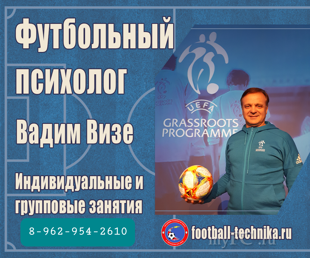 Уважаемые тренеры, родители спортсменов, юные и профессиональные футболисты! Стартует новый футбольный сезон, и я, Визе Вадим Анатоьевич, приглашаю вас на консультации и групповые занятия по психологической подготовке. Тренеры, родители и юные футболисты из 12 городов уже воспользовались возможностью пригласить меня и провести методические семинары и психологические консультации. Санкт- Петербург, Ереван, Саратов, Курск, Владивосток, Вологда, Воронеж, Владикавказ, Камышин, Пенза, Барнаул, Москва. В Москве принимаю в психологическом Центре у метро Трубная.