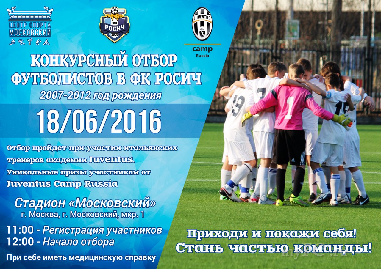 Конкурсный отбор юных футболистов в группы спортивной подготовки футбольного клуба Росич состоится 18 июня на стадионе "Московский". Возможность принять участие в отборе есть у всех желающих в возрасте от 4 до 9 лет. Тренерский состав клуба подготовил интересные упражнения, в процессе выполнения которых определятся самые быстрые, ловкие и координированные ребята. Благодаря нашим друзьям #JuventusCampRussia в мероприятии примут участие итальянские тренеры из системы подготовки резерва футбольного клуба Juventus. Участники, наиболее ярко проявившие себя в конкурсных упражнениях будут вознаграждены сертификатами на бесплатное участие в московской смене международного футбольного лагеря Juventus Camp Russia! Добро пожаловать! Welcome! Benvenuto!