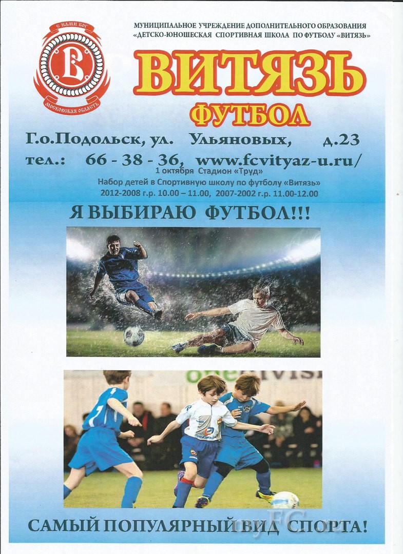 1 октября 2017 года с 10 до 12 часов Спортивная школа по футболу «Витязь» г. Подольск на запасных полях СК «Труд» будет проводить набор-отбор мальчиков 2002 - 2012 г.р.
