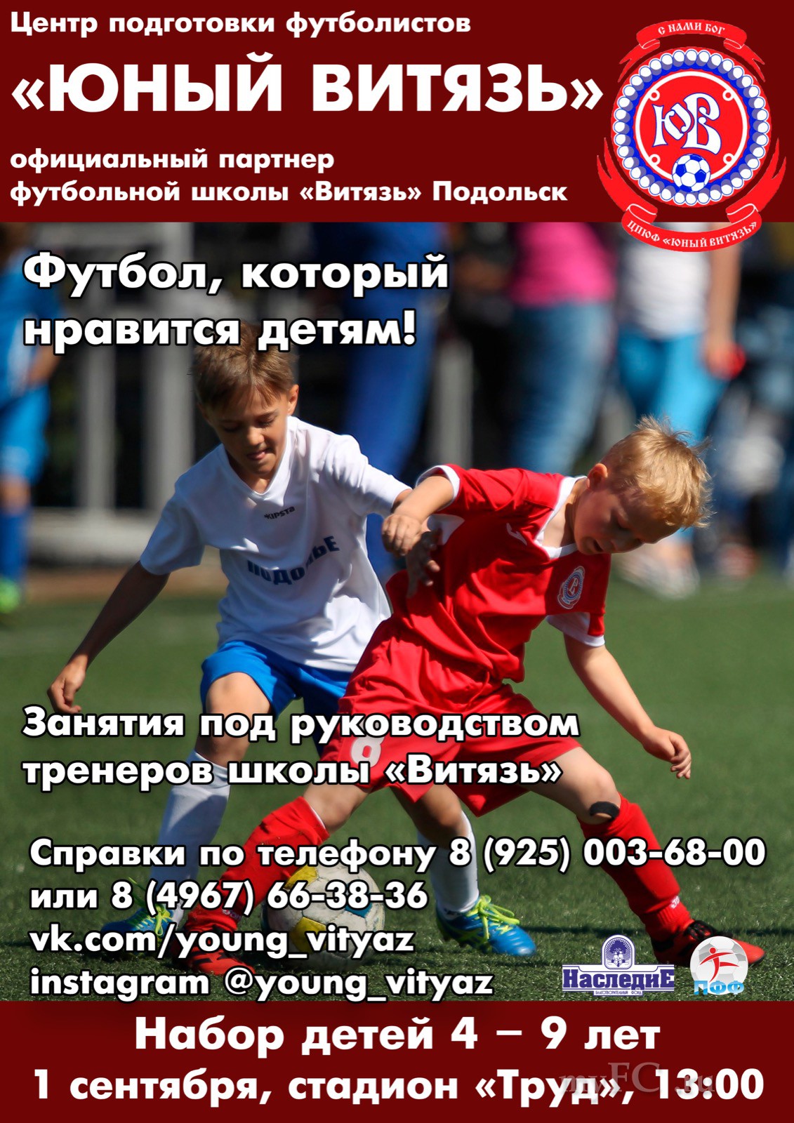 1 сентября в 13:00 на стадионе «Труд» (г. Подольск) состоится набор ребят в одну из ведущих футбольных школ Московской области – футбольную школу «Витязь». А для самых маленьких будущих футболистов состоится набор в центр подготовки «Юный Витязь», в котором под руководством опытных тренеров нашей футбольной школы будут заниматься ребята 4-9 лет.