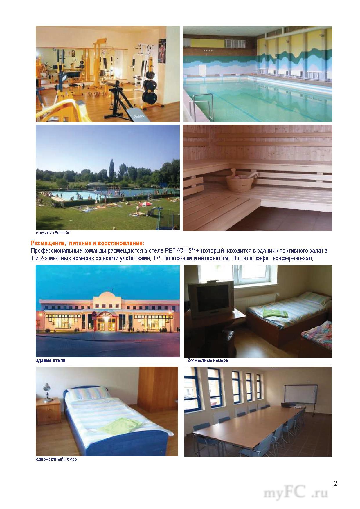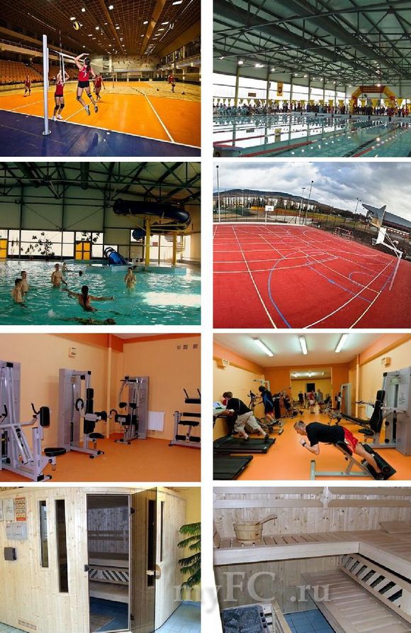 Объекты спорткомплекса находящиеся под одной крышей с новым отелем: - Современный спортивный зал 45 х 24 м с сертифицированным покрытием Marmolem Sport . - Аквапарк с бассейном 25 м и комплексом закрытых и открытых восстановительных бассейнов. - СПА центр с 2 саунами, 2 турецкими банями, криокамерой, соляной комнатой-пещерой, солярием, массажем. - Современный большой тренажерный зал на 75 сертифицированных JWF тренажеров и зал для аэробики. - Большой бильярдный зал на 6 бильярдных столов и современный боулинг-центр на 4 дорожки. - Оборудованные Большой конференц зал на 270 чел и два малых конференц зала для теоретических занятий. - Новый отель уровня 3*** на 80 мест (2-х и 1-но местные номера, два апартамента) с баром и рестораном на 100 мест.