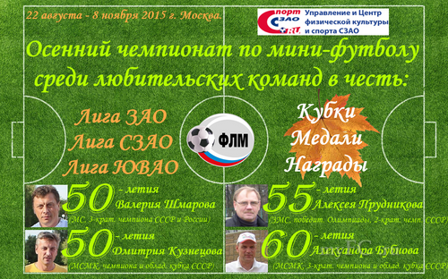 Фонд «Любительского мини-футбола» (ФЛМ) приглашает команды сыграть в осеннем чемпионате по мини-футболу среди любительских команд 2015 года в честь: