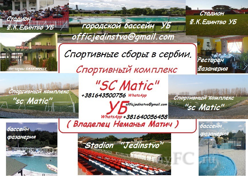 СЕРБИЯ, ЛЕТНИЕ СПОРТИВНЫЕ СБОРЫ Спортивный комплекс "SC Matic" который находится в Сербии (город Уб)создан для подготовки спортсменов ,быстрого физического восстановления и улучшения всей физической формы.Также вы сможете воспользоваться бассейном.Проживание в отеле "Fazanerija". Апартаменты для 80 человек.Также мы предаставим вам возможность съездить на экскурсии,узнать город где вырос Неманья Матич.Также можно будет посетить городской бассейн.Спортивный центр SC Matic построил Неманья Матич для детей ,чтобы они могли играть футбол.Трансфер до города будет организован ,а также будут организован спаринг с местной командой Jedinstvo Ub (владелец клуба Неманья Матич) , также сюда приезжают дети из других стран . Можем организовать и матчи с командами из другого города. Для тренировок мы предаставим вам 2 Спортивных комплекса: 1 комплекс SC Matic он состоит из 1 искуственного футбольного поля стандартных размеров, сейчас там ведуться постройки 2 поля травяного покрытия. 2 спортивный комплекс Skolarac , он состоит из 3 футбольных полей травяного покрытия и все они стандартных размеров . Питание 3-разовое (спортивное). Также каждый получит подарок ,и сможете сфотографироваться с Неманьом Матичем ,который сейчас выступает за Лондонский Челси, Урош Матич ,который играет за Копенгаген,Радован Петрович играет за Лисабонский Спортинг.Все они выросли в этом городе.Также будет фотограф ,который к концу сборов предоставит вам фотографии в любом виде.
