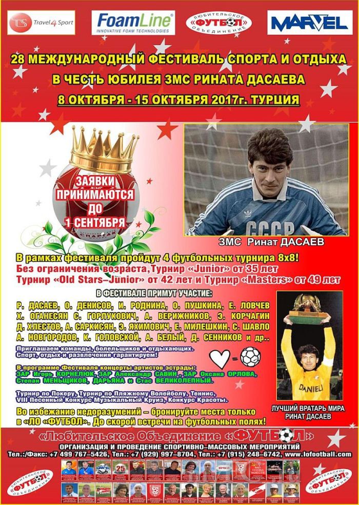 Любительское Объединение Футбол, компании FoamLine и МАРВЕЛ приглашают Вас на 28 Международный Фестиваль Спорта и Отдыха в честь юбилея ЛУЧШЕГО ВРАТАРЯ МИРА 1988 года РИНАТА ДАСАЕВА! Фестиваль состоится в Турции (Сиде) с 8 октября - 15 октября 2017 года, отель SUENO Hotels Beach Side 5* Ultra All Inclusive! Спорт, отдых и развлечения ГАРАНТИРУЕМ! Удачи и до встречи!