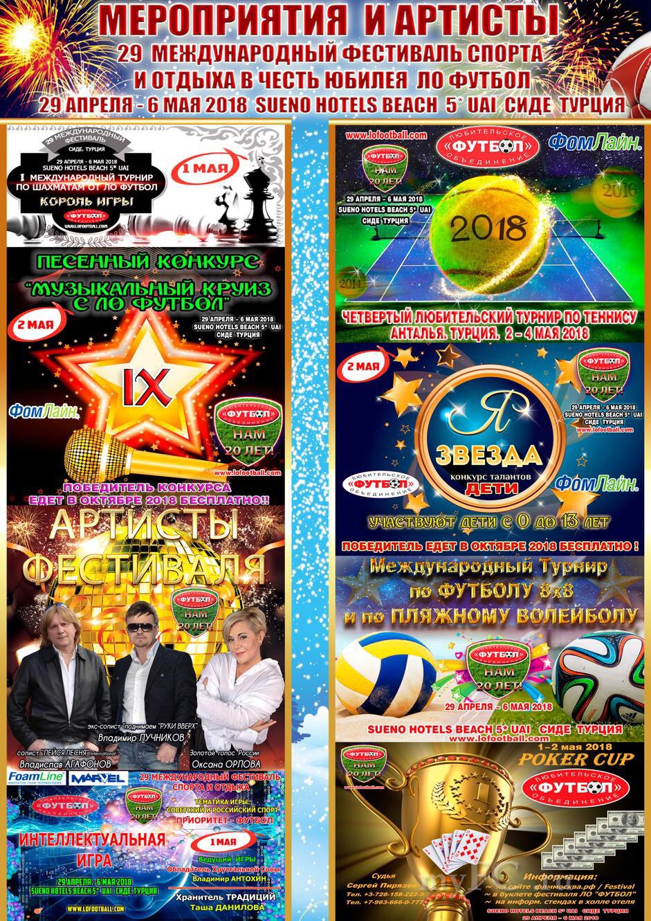 В ПРОГРАММЕ ФЕСТИВАЛЯ: Футбольный Турнир 8х8 в ЧЕТЫРЁХ возрастных категориях (Без ограничения возраста, 35+, 42+, 48+): выход на регламент, концерты Артистов Эстрады: ЗАР Владислав Агафонов (Лейся Песня International), Владимир Лучников (экс солист "поднимаем Руки Вверх"), Оксана ОРЛОВА (Обладатель премии Шансон Года, Золотой Голос России)), IX Песенный Конкурс "Музыкальный Круиз с ЛО Футбол" (победитель едет в Октябре 2018 на Фестиваль бесплатно), ХI Турнир по покеру, Теннис (одиночный и парный разряд), Международный турнир по Пляжному Волейболу, Международный Турнир по Шахматам, Детский Конкурс Талантов "Я ЗВЕЗДА" (победитель едет в Октябре 2018 на Фестиваль бесплатно), VI Интеллектуальная Игра (ведущий - обладатель Хрустальной Совы - Владимир Антохин) и другие развлечения...