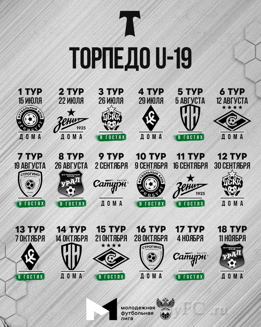 Сезон Молодежной Футбольной лиги стартует 15 июля. В первом туре «Торпедо U-19» встречается с «Оренбургом» на стадионе «Авангард» в г. Домодедово.