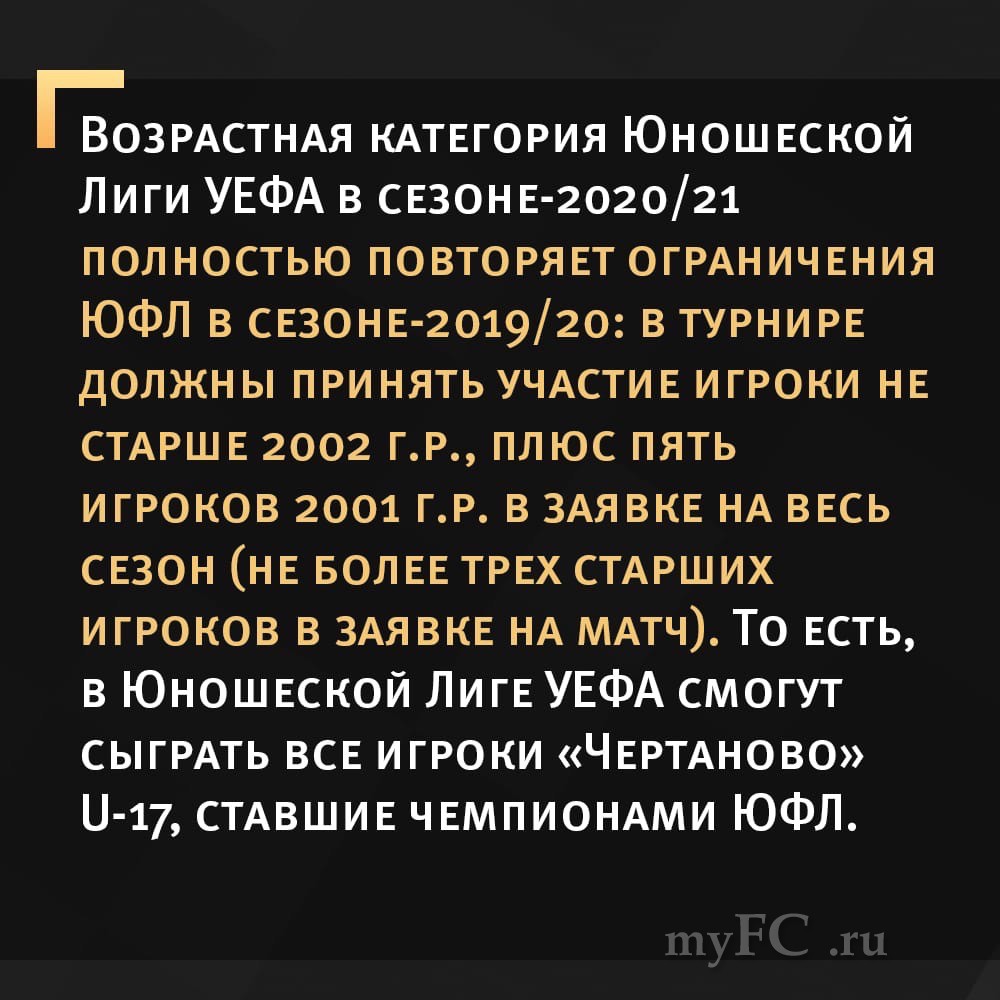 Отметим, что возрастная категория Юношеской Лиги УЕФА в сезоне-2020/21 полностью повторяет ограничения ЮФЛ в сезоне-2019/20: в турнире должны принять участие игроки не старше 2002 г.р., плюс пять игроков 2001 г.р. в заявке на весь сезон (не более трех старших игроков в заявке на матч). То есть, в Юношеской Лиге УЕФА смогут сыграть все игроки «Чертаново» U-17, ставшие чемпионами ЮФЛ.