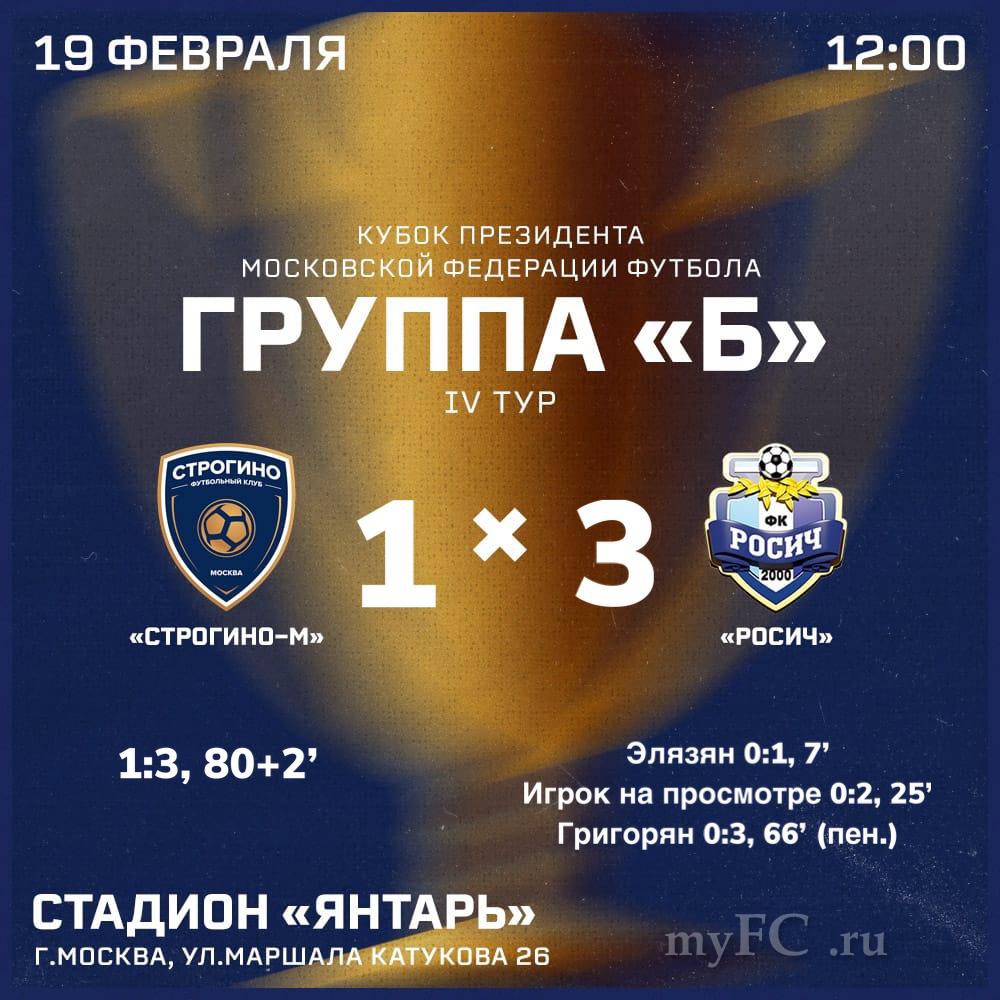 В очередном туре группового этапа Кубка Президента Московской Федерации Футбола ФК «Росич» уверенно превзошёл команду «Строгино-м» 3:1 и досрочно вышел в финал этого предсезонного турнира.