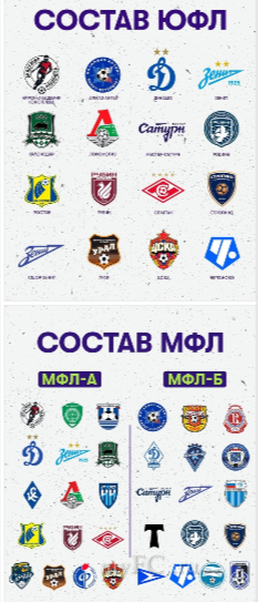 Молодежная футбольная лига.Вместо 20 команд в МФЛ выступят 32 клуба, которые будут поделены на два дивизиона – А и Б. Дивизион А сформирован из 13 молодежных команд клубов – участников Мир РПЛ и трех клубов Мелбет Первой лиги.