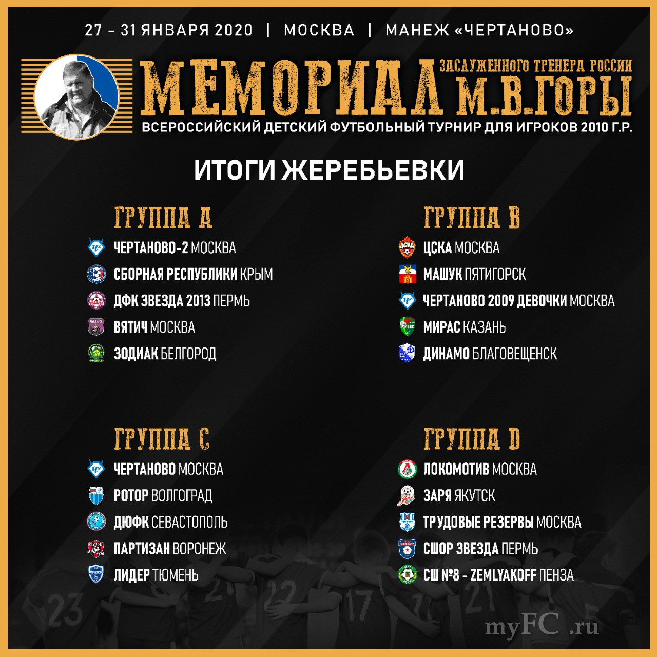 С 27 по 31 января в манеже футбольной школы «Чертаново» (Москва, ул.Чертановская, д.7, кор.3) пройдет первый в истории Всероссийский детский футбольный турнир памяти заслуженного тренера России Михаила Горы для игроков 2010 года рождения!