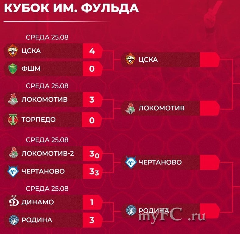 В среду, 25 августа, команды встретились вновь, но уже в рамках четвертьфинала Кубка Москвы им. Р.Фульды. Футболисты первого отделения Академии «Чертаново» 2008 г.р. (тренеры – Дмитрий Шестаков, Иван Лужников) трижды выходили вперёд в счёте – именно Глеб Белоусов оформил хет-трик! Однако, «Локомотив-2» каждый раз отвечал своим голом – основное время завершилось вничью 3:3. Серия пенальти получилась удивительной: чертановцы спокойно реализовали три удара, а хозяева – ни одного (два удара выше и сэйв Данилы Маняка).