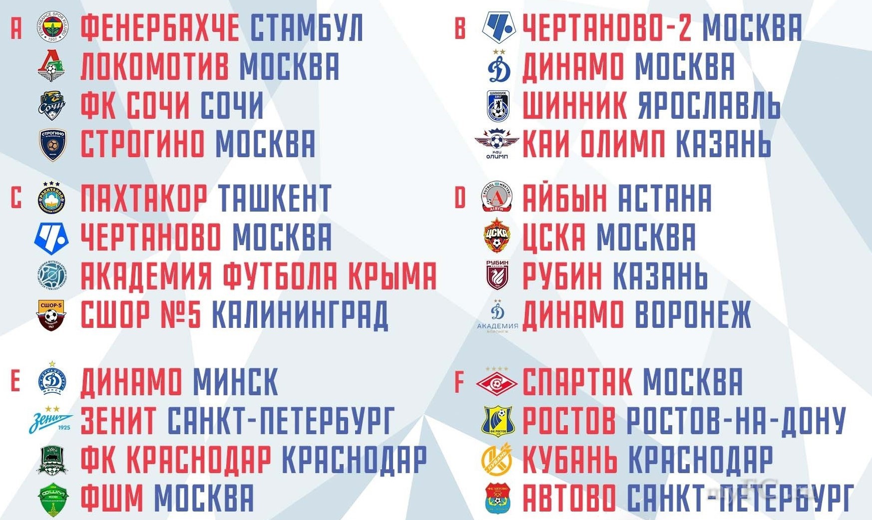 19 российских молодежных команд, среди которых «Зенит» (Санкт-Петербург), «Спартак» (Москва), «Локомотив» (Москва), ЦСКА (Москва), «Динамо» (Москва), «Рубин» (Казань), «Краснодар», «Ростов» и «Сочи», а также другие;