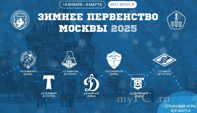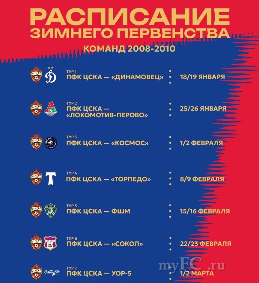 На эти же даты назначены и игры с участием команд 2010-2011 и 2008-2009 гг. рождения. Первые выяснят отношения с «Динамо» (18/19 января), «Локомотивом» (25/26 января), «Юностью Москвы» (1/2 февраля), «Спартаком» (8/9 февраля), «Рублёво» (15/16 февраля), «Строгино» (22/23 февраля) и «Торпедо» (1/2 марта).
