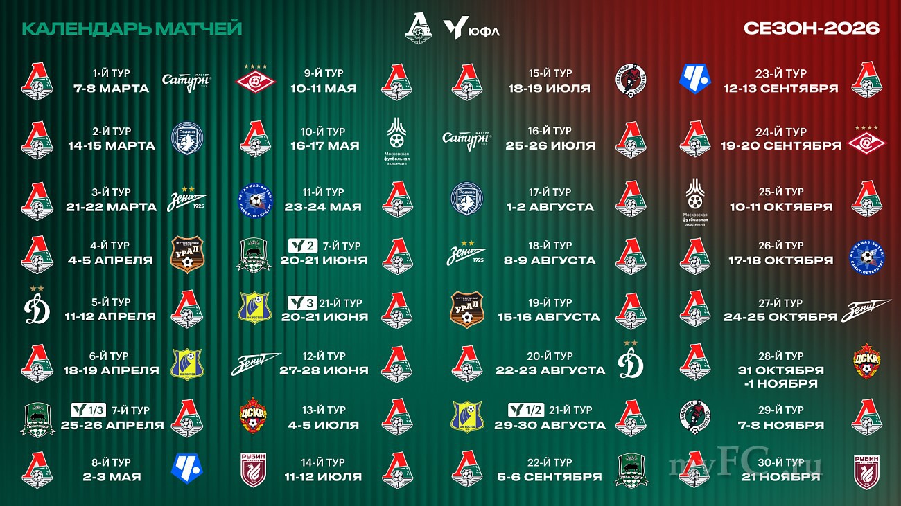 Российский футбольный союз утвердил список участников и расписание Молодёжной футбольной лиги, а также федеральной ЮФЛ в сезоне 2026 года. Первые матчи МФЛ пройдут 6 марта, федеральной ЮФЛ – 7-8 марта.