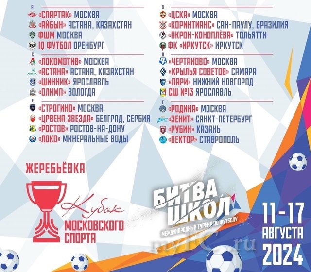С 11 по 17 августа в Москве пройдет второй международный футбольный турнир «Кубок Московского спорта – Битва Школ» среди мальчиков 2013 года рождения. Соревнования принимает спортивный комплекс «Локомотив», а матч за третье место и финал пройдут на «РЖД Арене».