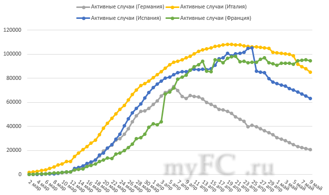 Основные евроэкономики отменяют ограничительные меры. Как видно по маркеру количества активных инфицированных Германия, Италия и Испания преодолели пик заболеваемости и устойчиво снижают количество зараженных. Франция вот уже пару-тройку недель как устойчиво болтается на плато.