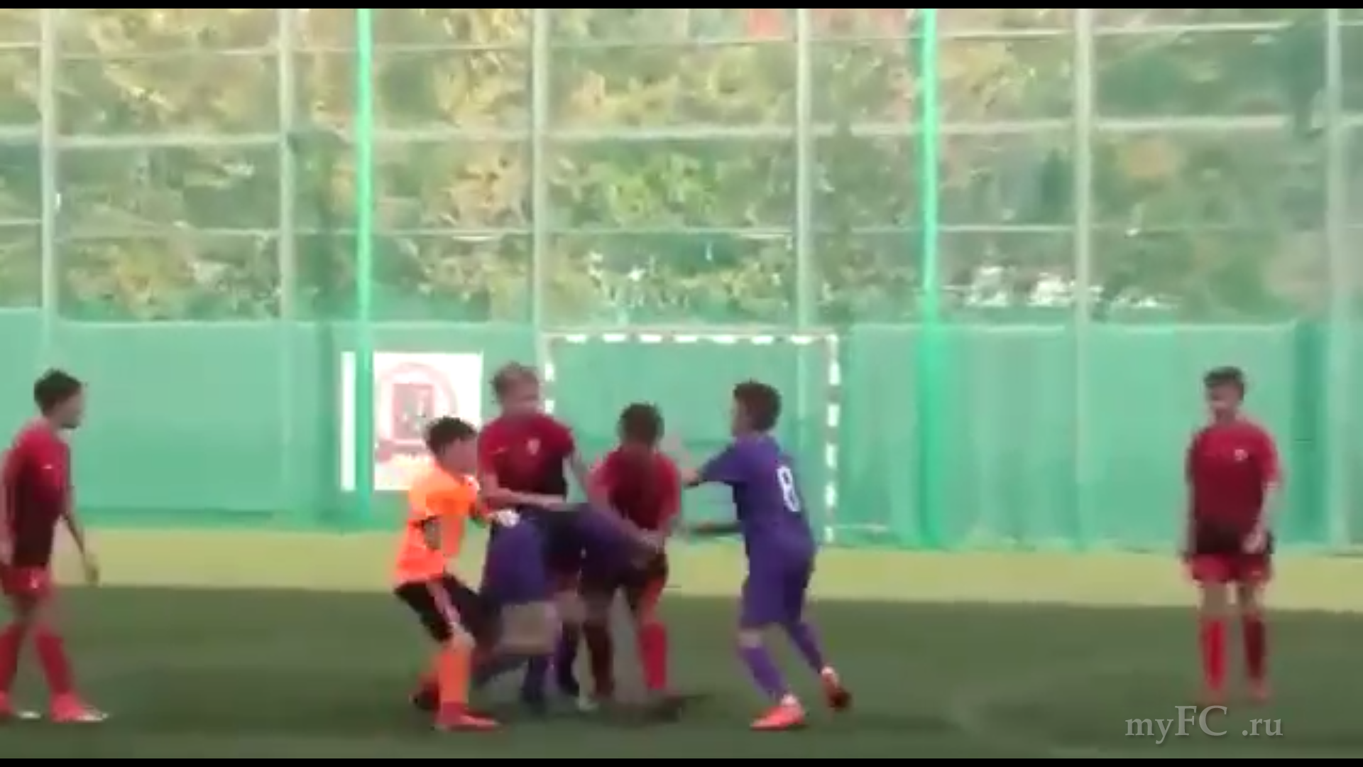 Как будто разное видео смотрят...без замедленного воспроизведения видно, что двое красногвардейцев бьют одного синего, затем подбегает вратарь и сует синему по почкам. Только после этого подбегает ещё один синий и, затем, папаша...